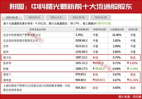 但实际上,葛卫东在中科曙光的排位可能要更高。对比来看,在葛卫东新进重仓的同时,张仲华、葛贵兰和葛贵莲三位自然人股东也有相似操作,其中张仲华、葛贵莲均对中科曙光进行了不同程度的增仓,葛贵兰则同样以新进的姿态成为公司的前十大流通股股东,不排除葛贵兰、葛贵莲和葛卫东互为一致行动人的可能。