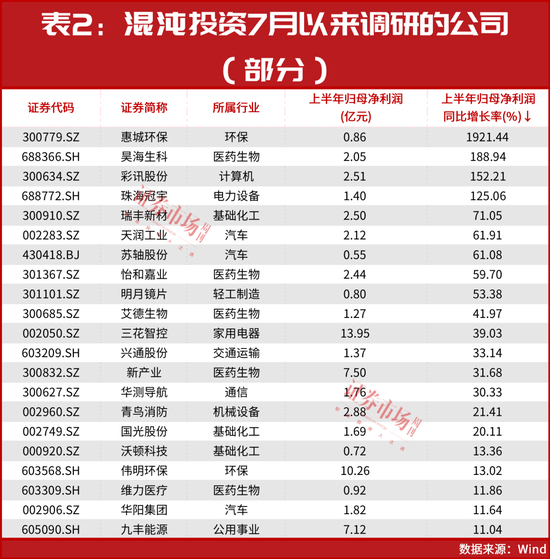 从实际情况来看,这些被混沌投资调研的公司普遍业绩较优。如截至目前共38家公司发布了半年报,其中有36家公司实现盈利,占比超九成。此外是,业绩实现同比增长的也有26家,占比接近七成。其中,业绩增速居前的有惠城环保昊海生科、彩讯股份和珠海冠宇,其归母净利润同比增速均在100%以上(见表2)。