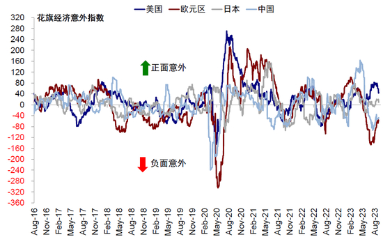 图表:8月,美国经济意外指数回落,欧元区、日本、中国抬升