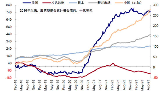 图表:8月,中国、日本、新兴市场流入加速,美国市场转为流出,发达欧洲流出加速