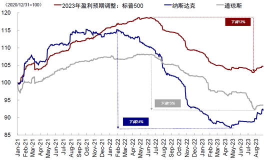 图表:纳斯达克综指2023年盈利预期自今年5月以来持续上修