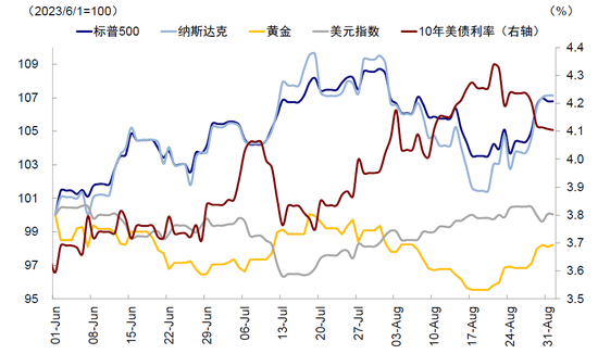 全球资产波动加剧,美国一度出现“股债双杀”,美元指数走强。8月初,惠誉下调美国主权信用评级,这一事件叠加美国财政部超预期的债券供给推动债利率快速攀升至4.3%以上,美股一度承压,纳斯达克从高点回调超7%,为去年10月反弹以来幅度最大且持续时间最长的跌幅,美元再度站上103。包括零售、工业产出、新屋开工等经济数据均超预期增长,亚特兰大联储连续上调美国三季度GDP预测至6%。经历了8月前半程的“股债双杀”后,债券供需错配缓解带动美债利率持续回落至4.1%。鲍威尔在Jackson Hole年会的发言偏中性,重申维持紧缩区域的重要性和 2%的通胀目标,但同时对加息持谨慎态度[1]。月末就业供给超预期修复,供需缺口继续弥合帮助工资压力缓解,市场对美联储11月进一步加息的预期再度回落。