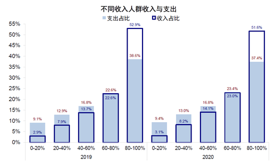 图表:低收入人群的收入和支出比例均有所抬升,中等收入人群支出比例持平,高收入人群收入和支出比例回落