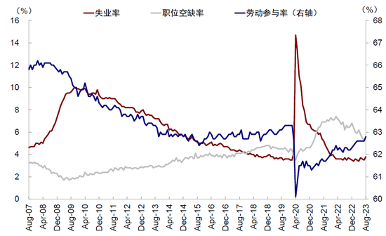 图表:8月非农就业供给继续超预期修复,时薪增速回落;失业率和劳动参与率双双抬升