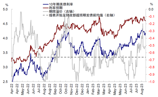 图表:我们测算当前期限溢价已逐步接近缩表开始至财政部超预期发债前的均值水平