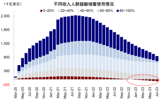 图表:低收入人群超额储蓄已经耗尽,高收入人群加速消耗,中等收入人群留存较多
