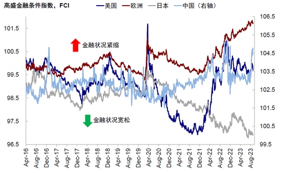 图表:8月,美国、欧元区、中国金融条件有所收紧,日本有所放松