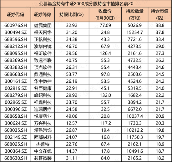 二季度末公募基金重仓中证2000指数成分股的流通市值达3598亿。其中健民集团、盛天网络、正帆科技持仓市值排名居前,均超30亿。