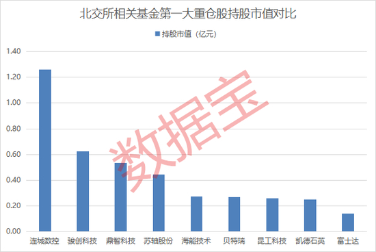 从基金中报重仓股上来看,作为北交所市值第二大个股,连城数控最受北交所相关基金青睐,8只北交所指数基金和2只北交所主题基金第一大重仓股均为连城数控,合计持股市值达到1.26亿元。北交所市值第一的贝特瑞相对逊色,仅位列2只北交所指数基金第一大重仓股。