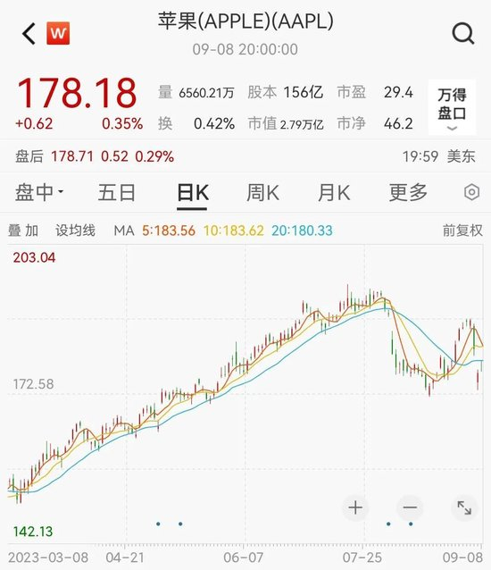 截止9月8日,苹果股价报收于178.180美元,上涨0.35%;最新总市值27857亿美元,相当于今年6月初的高点。