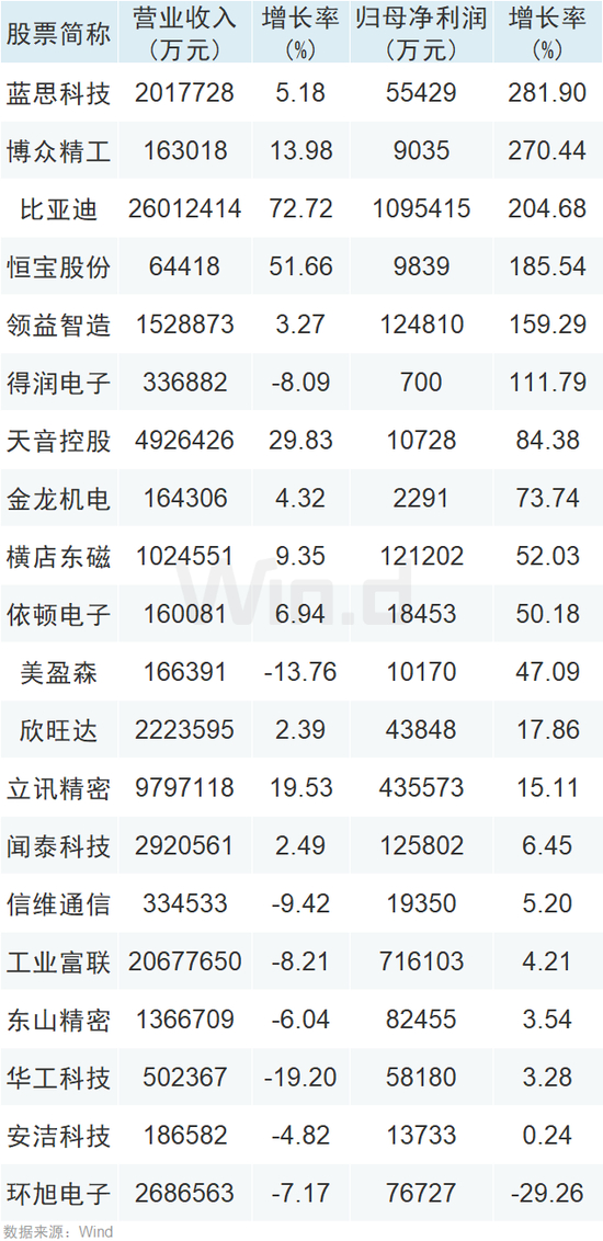从业绩增幅来看,蓝思科技以281.9%的增幅排名第一;博众精工、比亚迪、恒宝股份、领益智造、得润电子共6家公司增幅超过100%。