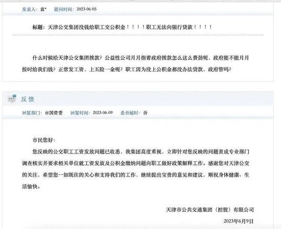 今年6月5日和8月23日,问政平台上仍有人反映,天津公交拖欠员工工资,没给职工缴纳公积金,导致职工无法办理房贷。天津公交集团作了同样的回复。