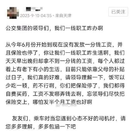 据海报新闻报道,天津公交集团表示不清楚此事;天津市国资委工作人员表示,从未接到公交集团职工投诉拖欠工资的问题。