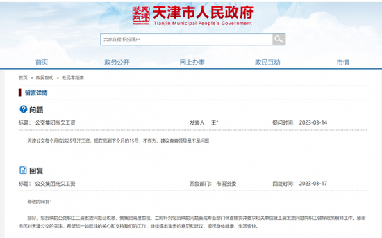 自今年3月份起,天津公交拖欠工资的内容开始在问政平台上出现。在天津市人民政府政民互动板块上,3月14日有留言称,“天津公交每个月应该25号开工资,现在拖到下个月的15号”。天津市国资委对此回复:反映的公交职工工资发放问题已收悉,集团高度重视,立即针对您反映的问题责成专业部门调查核实并要求相关单位就工资发放问题向职工做好政策解释工作。