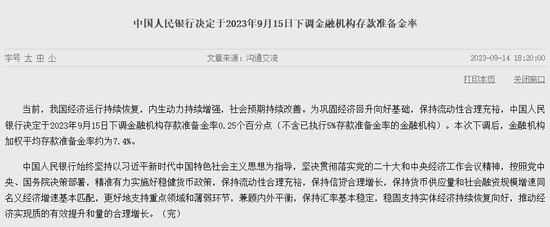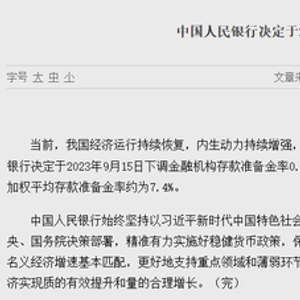 9月14日,人民银行发布消息称,为巩固经济回升向好基础,保持流动性合理充裕,决定于2023年9月15日下调金融机构存款准备金率0.25个百分点(不含已执行5%存款准备金率的金融机构)。本次下调后,金融机构加权平均存款准备金率约为7.4%。
