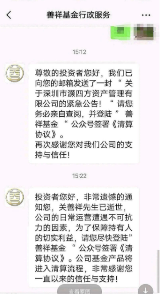 有多位投资者发布的一则微信聊天显示,名为善祥基金行政服务的人提示:善祥基金董事长关善祥已逝世。请投资者尽快登录“善祥基金”公众号签署《清算协议》,公司基金产品将进入清算流程。