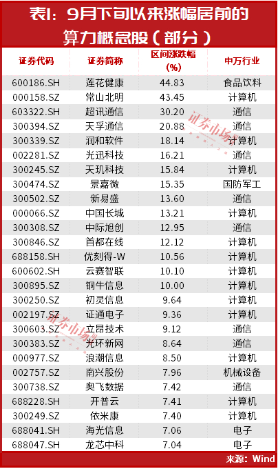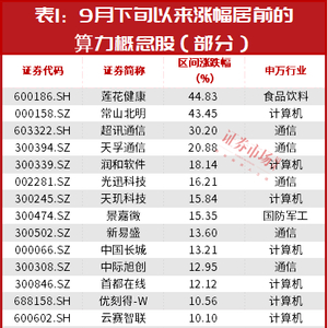 莲花健康股价被热炒背后,市场对于算力板块的整体关注度也在升温。自9月下旬以来(截至10月11日,下同),算力板块即开启了持续反弹模式,截至目前,已累计上涨超6%。部分个股更是迎来强势上涨,如莲花健康、常山北明、超讯通信、天孚通信等期间涨幅均超过20%,润和软件、光迅科技、天玑科技、景嘉微、新易盛、中国长城、中际旭创等多只个股涨幅均超过10%(见表1)。