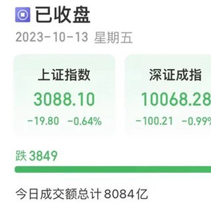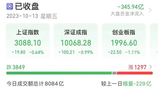 10月13日,三大指数集体收跌。截至收盘,沪指跌0.64%,深成指跌0.99%,创业板跌1.11%。个股跌多涨少,两市逾3800股飘绿。