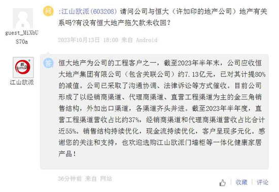 今日上午,江山欧派在互动平台回复投资者提问称,恒大地产为公司的工程客户之一,截至2023年半年末,公司应收恒大地产集团有限公司(包含关联公司)约7.13亿元,已对其计提80%的减值。