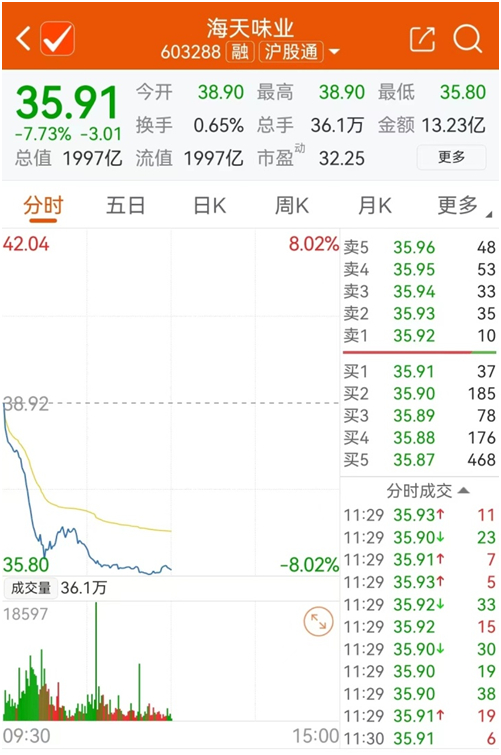 今日早盘,调味品龙头海天味业股价遭遇“闪崩”,盘中最大跌幅超8%,并创下近4年半新低。截至午间休市,海天味业股价报35.91元,半日下跌7.73%,今年以来累计跌幅达45%。