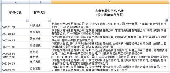 根据Choice数据,截至2022年年报,恒大系公司出现在多家A股家具建材类企业的应收账款前五名单中。