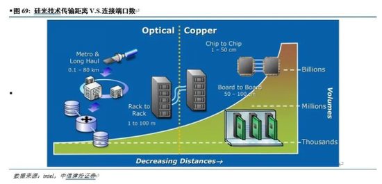 对比硅基、磷化铟和铌酸锂等材料光器件的发展历史,集成化为未来最终发展方向。从硅光技术应用场景来看,呈现传输距离越来越短,端口数越来越多的趋势。铜退光进的光通信进程,同时也伴随着传输距离的逐步减短。因此根据Intel的观点,硅光通信技术早期应用于电信长距离传输网络之中,逐步向数通领域以及未来的板与板、芯片与芯片互连发展。此外,铌酸锂具有电光系数大、调制带宽大、损耗小、稳定性好等优点,广泛应用于相干光通信及军事航天陀螺仪等产品中。薄膜铌酸锂器件将大大减小尺寸,有望广泛应用于光模块和光器件等多个领域,市场规模进一步提升。