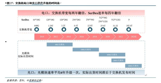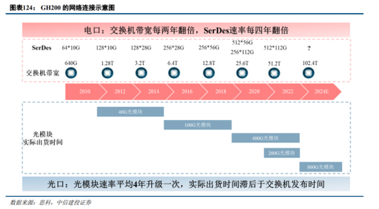 根据我们的测算,训练端A100和200G光模块的比例是1:7,H100和800G光模块的比例是1:3.5。800G光模块2022年底开始小批量出货,2023年需求主要来自于英伟达和谷歌。在2023年这个时间点,市场下一代高速率光模块均指向800G光模块,叠加AIGC带来的算力和模型竞赛,我们预计北美各大云厂商和相关科技巨头均有望在2024年大量采购800G光模块,同时2023年也可能提前采购。