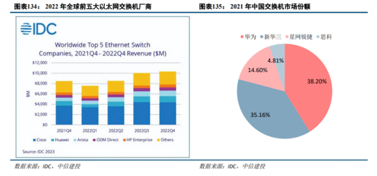 交换机:与传统数据中心的网络架构相比,AI数据网络架构会带来更多的交换机端口的需求。交换机具备技术壁垒,中国市场格局稳定。