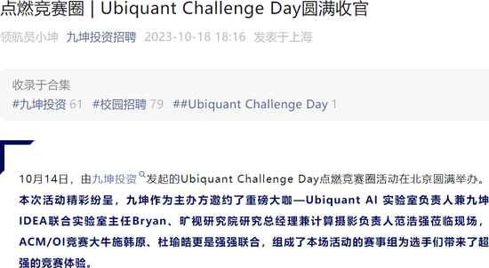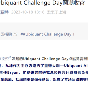 九坤投资发布消息称,近日由公司发起的Ubiquant Challenge Day点燃竞赛圈活动在北京举办,此次活动的初衷是提供一个切磋和交流的舞台,让各位竞赛大神们重聚于此,让退役选手们重温竞赛,也让现役选手们在竞赛中快速成长。