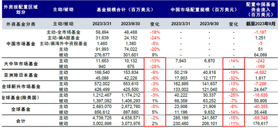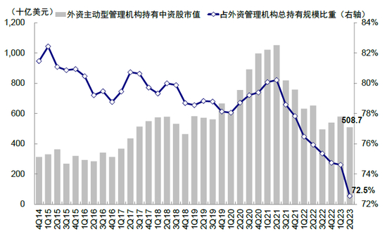 图表10:根据FactSet自下而上汇总,截至2Q23,主动外资持有中资股回落至5,087亿美元,环比降12.2%