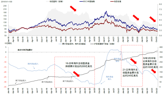 往前看,根据上文中的分类,主权型资金受非基本面因素影响大,而这一因素并非短期可以解决;交易型资金在市场超跌或者其他催化剂出现时很容易回流,但占比有限也不具备长期持续性。因此,长期的外资动向需要基本面改善为前提,难以大幅领先市场,历史上的几个拐点,如2016年,2019年底和2020年下半年,都符合这一特征(图表23)。