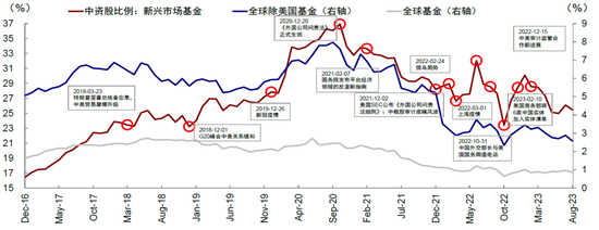 图表20:近年来国内外包括中美关系、地缘局势等因素影响,海外资金中国配置比例持续走低