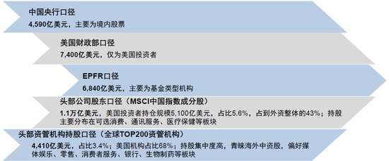 图表1:多维度、多口径汇总当前海外资金持有中资股情况