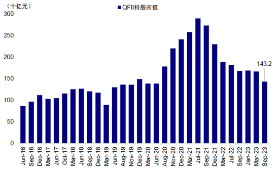 图表11:截至9月末外资通过QFII持有A股总市值约为1432亿元