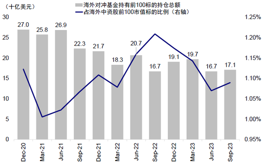 图表27:根据FactSet自下而上拆解,海外对冲基金持有海外中资股市值前100标的总额约171亿美元