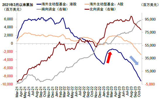 图表14:海外主动资金年初一度回流,但三月中旬以来持续流出A股与港股市场