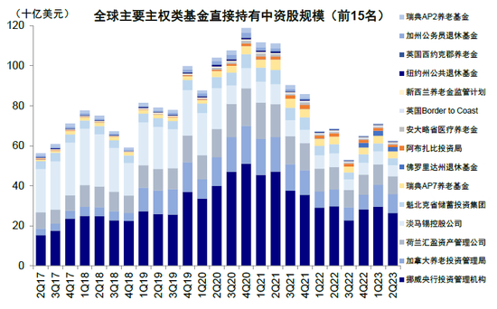 图表30:全球主要政府类基金持有中资股规模较4Q20高点明显回落,当前直接持有规模约为622亿美元