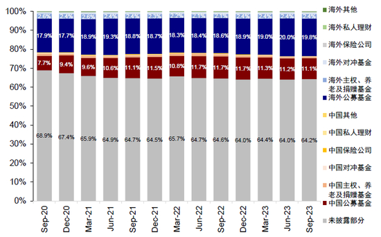 我们通过自下而上汇总MSCI中国指数100权重股的投资者结构,以呈现海外投资者三类画像(图表24~图表25)如下。需要说明的是,受数据局限和交叉投资约束(如一些主权和养老机构对共同基金的委外投资),我们无法掌握外资全貌,因此这一分类只能作为一个粗略且静态参照。具体来看,