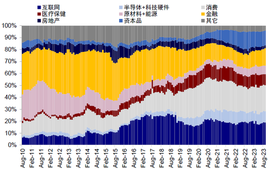 EPFR口径下的全球主动型资金今年3月以来维持弱势,配置比例同样下降。截至9月底,全球主动型资金(相比被动基金)低配中国市场0.22个百分点,较8月的0.15个百分点低配进一步下滑(图表5)。分不同区域看,全球(除美国)基金与亚洲除日本主动基金配置中资股规模较3月底年内配置高点分别下滑25%与19%,下滑幅度最大(图表7)。板块层面,互联网与金融板块自2021年初开始转为低配,资本品与科技硬件转为超配,一直延续至今,近期都有所加强(图表8~图表9)。