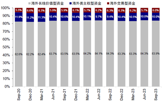 图表25:外资画像中,长线价值型资金占主导(80%以上),类主权型与交易型分别约占10%与5%以上