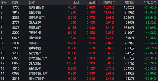 10月6日,地产板块普涨。新城悦服务涨13.56%,融创中国涨11.59%,雅居乐集团涨9.09%,领涨恒生地产建筑业指数。