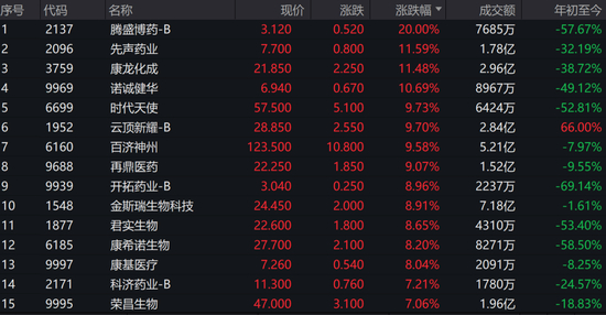中国生物制药涨5.85%,在蓝筹股中名列第三。腾胜博药涨20%,先声药业涨11.59%,康龙化成涨11.48%,领涨恒生医疗健康行业指数成分股。