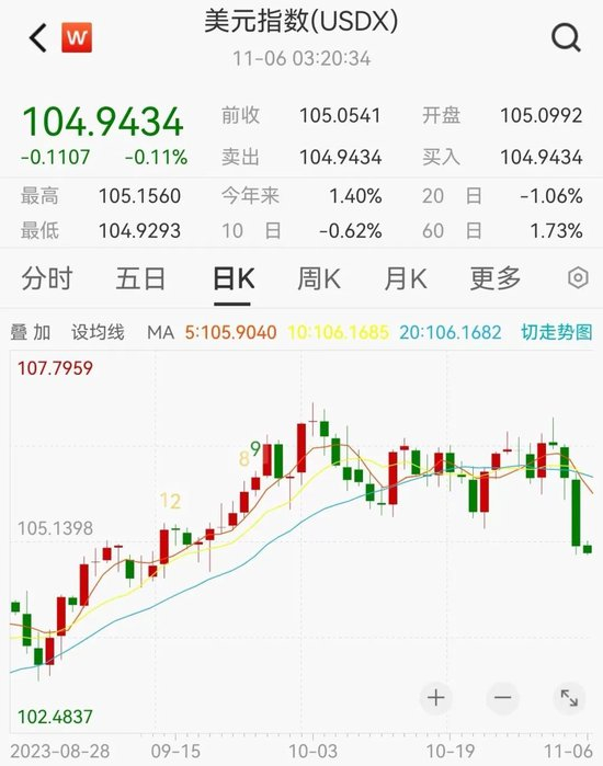 近期,美元指数一度快速杀跌,上周四和周五连续回落,并跌破近期连续震荡盘整的平台,最低跌破105关口创9月下旬以来新低。而美债收益率短、中期也有所回落。