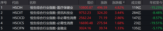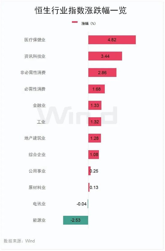 从行业表现看,恒生行业指数日内多数上涨,医疗保健业涨4.82%,资讯科技业涨3.44%,非必需性消费涨2.86%。跌幅方面,能源业跌2.53%,电讯业跌0.04%。