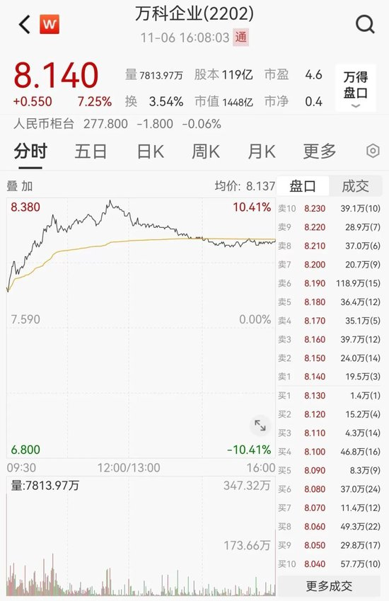 10月6日,万科企业股价高开高走,最高涨幅达10.41%,最终收于8.14港元,涨7.25%。对于投资者担心的债务违约风险,万科回应称,公司基本面没有出现任何问题。深圳市国资委领导表示,万科是深圳国资体系重要成员,具备足够的安全性。