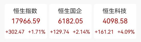11月6日,香港三大股指全线大涨。恒生指数涨1.71%,报17966.59点,盘中一度升穿18000点重要关口。恒生科技指数涨4.09%,报4098.58点,创近两个月收盘高位。恒生国企指数涨2.14%,报6182.05点。恒生红筹指数涨1.25%,报3440.07点。大市成交1151.89亿港元。南向资金净买入额为8.35亿港元。