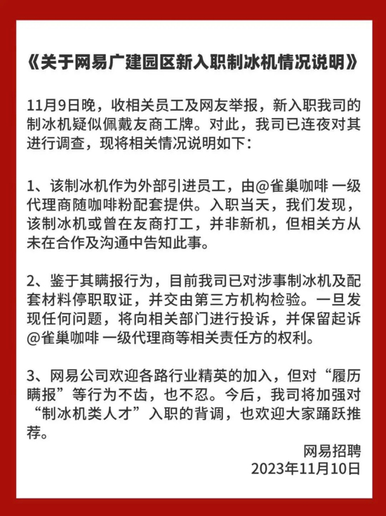 此外,11月10日,网易招聘账号发布情况说明称,雀巢咖啡及其代理商在未提前告知情况下,向网易提供二手制冰机,对此类行为网易不齿、也不忍。鉴于其瞒报行为,目前公司已对涉事制冰机及配套材料停职取证,并交由第三方机构检验。网易表示,一旦发现任何问题,将向相关部门投诉,并保留起诉雀巢咖啡一级代理商的权利。