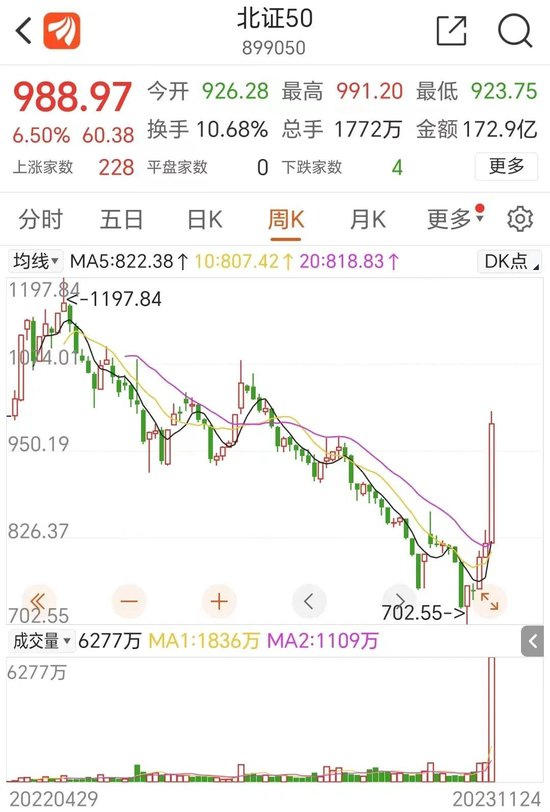 滦海资本董事长高凤勇向中国基金报记者指出,虽然北证50近期从700点快速飙涨到1000点,涨了43%;但最近天天封板涨几倍的小票都不在北证50之中,如果有北证综指,涨幅会更高。