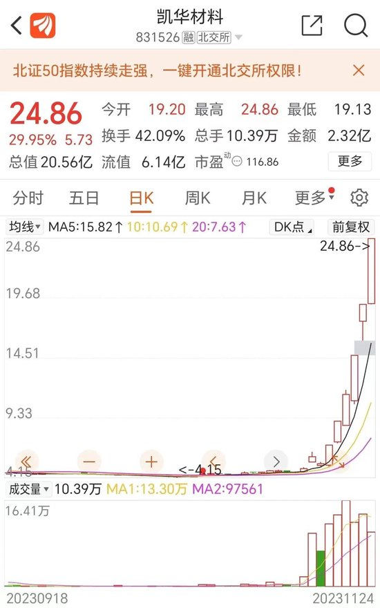 自10月24日至今,北证50(899050)暴涨43.37%,刚刚过去的5个交易日更是量价齐飞、加速飙涨,周涨幅高达20.96%,凯华材料8个交易日飙涨405.28%;周二日成交额首次突破100亿元大关,且连续4天稳步增长至周五的182.95亿元。