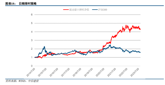 利用ETF资金流入-收益划分象限后构造择时信号的方法,以沪深300类ETF为例使用该方法对其进行择时,在样本外滚动测试中,择时累计收益327.01%,年化收益17.59%。策略在周频和月频下年化收益分别为18.55%和16.3%。日频换手52.7倍,周频平均年换手20.1倍,月频平均年换手9.6倍。